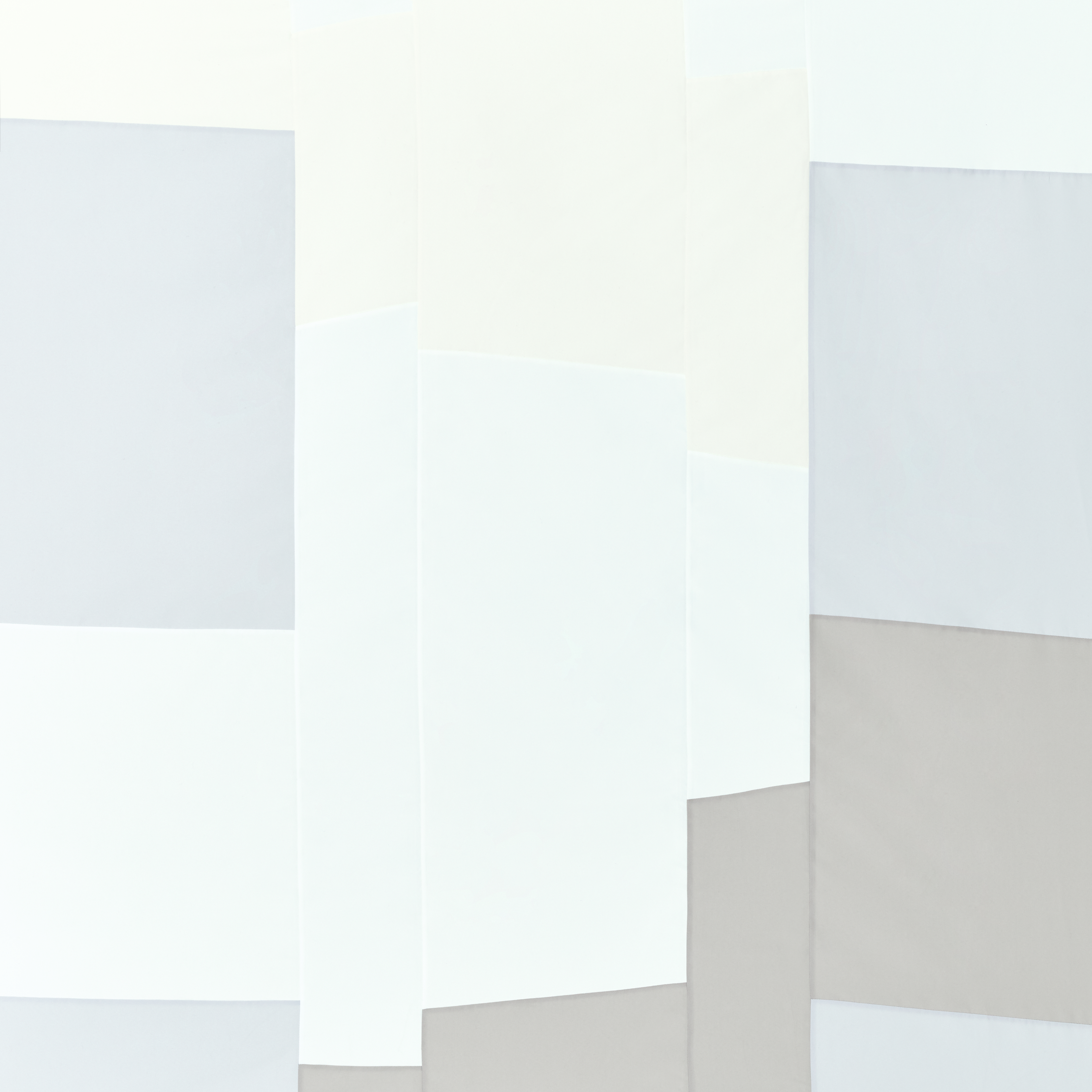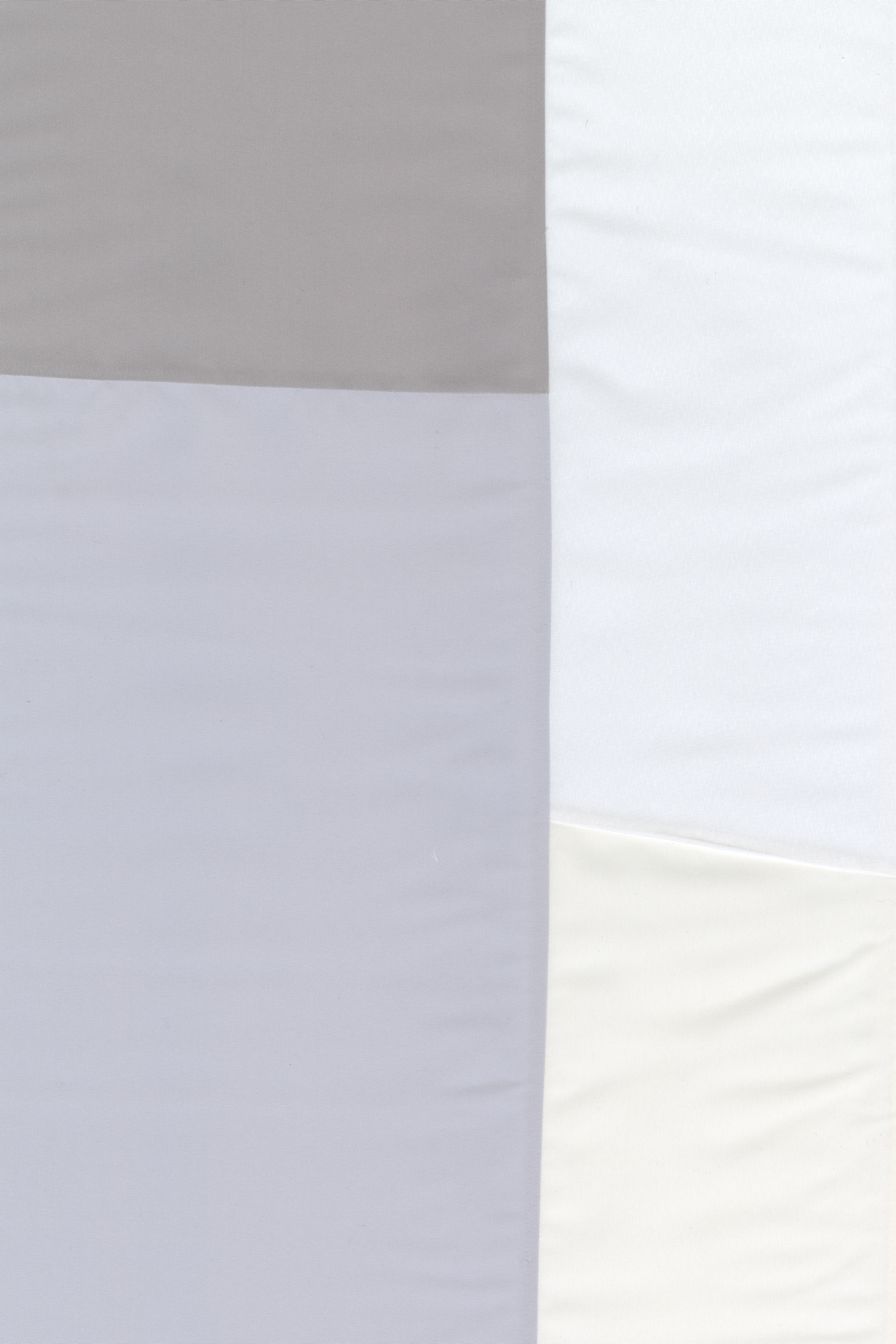 In Between unites blocks of colour that recall bird's eye perspectives of fields spread across the countryside. It is hand sewn using the patchwork technique and juxtaposes white and neutral tones with two vivid accent hues.