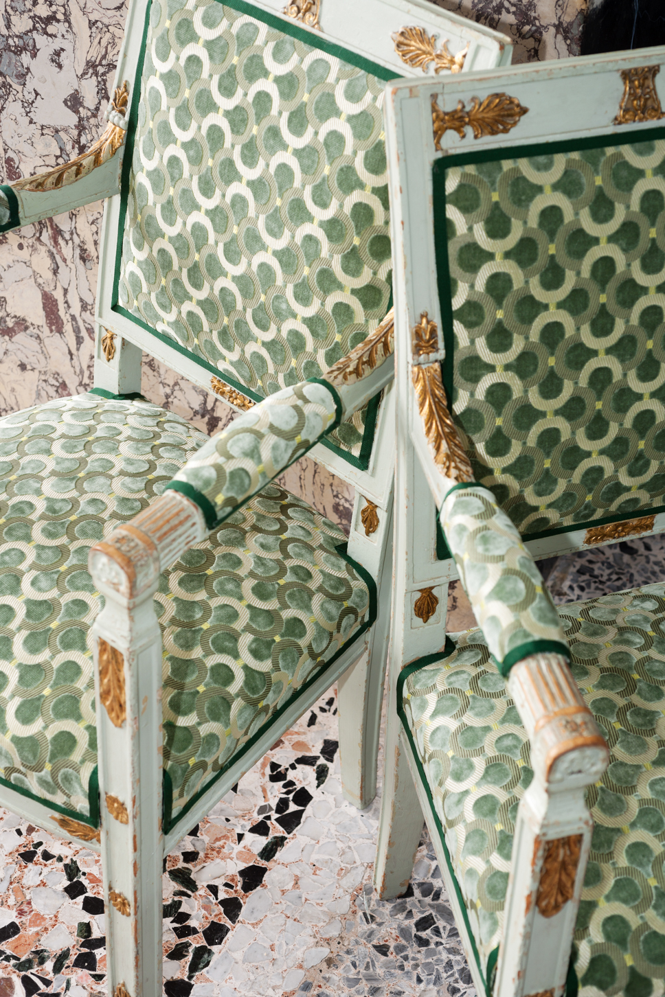 The passion for discovery, the surprise of a chance encounter. As in a vintage boutique we find unexpected treasures, in Scarabeo, our gaze explores an intertwining of stimuli and innuendos, between the fashion of the sixties and seventies, the Ascot motifs and other traditional strands of the art of tie making. A minute geometry lays out a recognizable and iconic design, discreet for its small scale but with a clear identity. This jacquard velvet infuses magnificence into a furnishing project and enriches its temporal make up, giving it weight. Its reference to other eras of fashion and taste brings an extra dimension.