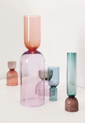 Minimal double-sided vessels composed of two different shapes in different transparent colors.