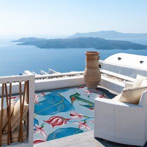 Amazzonia outdoor rug boasts a special tropical flower and leaves pattern in shades of blue featured by a hummingbird, among the most popular current design trends.