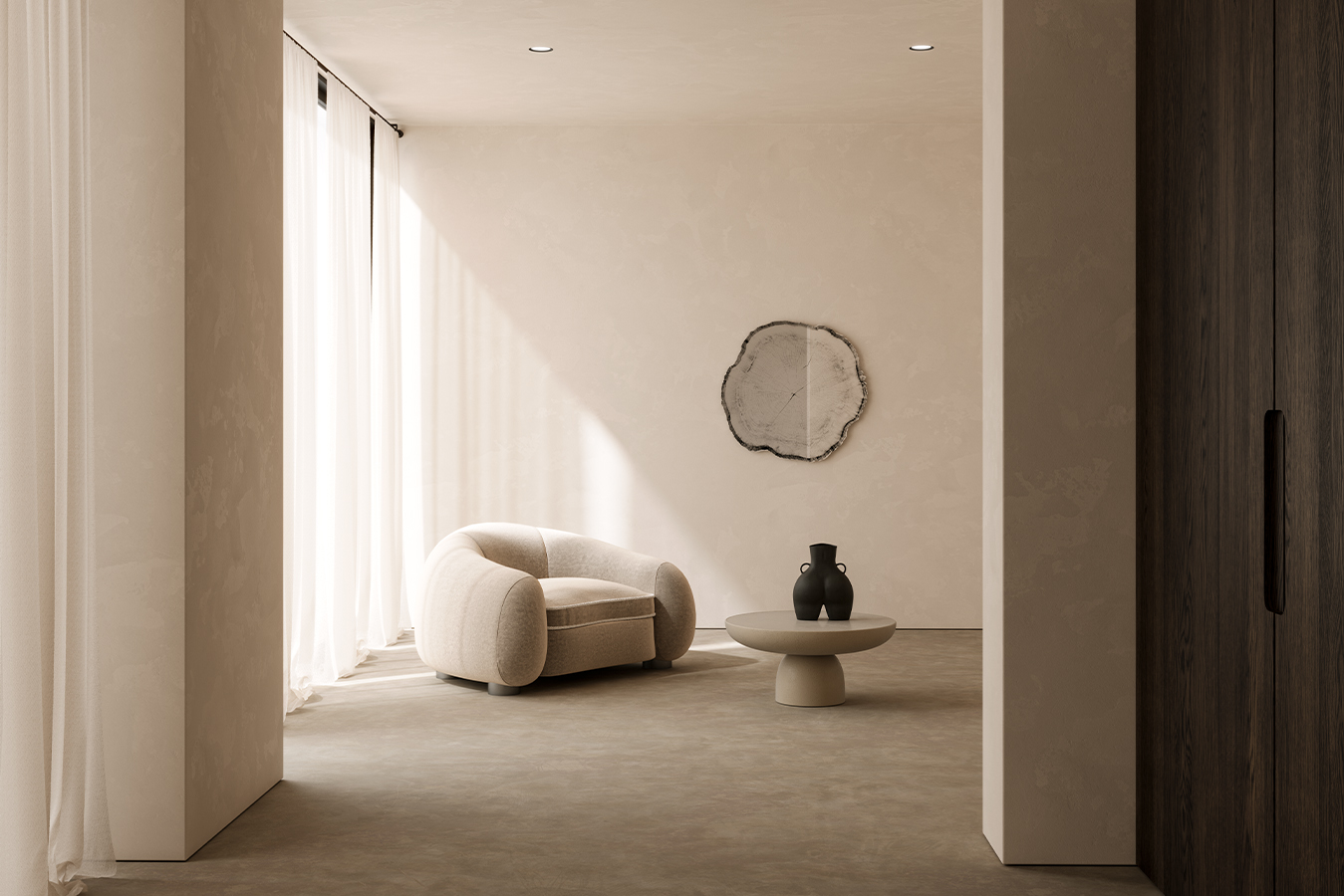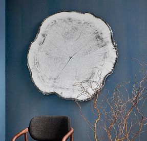A warm mirror thanks to its natural shape and print. This iconic mirror reflects the interior in a muted way, filtered by the soft and subtle annual rings that are traced on the mirror glass.