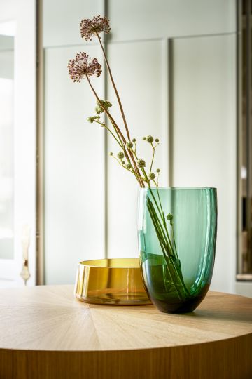 Colours like gemstones – from emerald green to amethyst violet – unfold their decorative effect in hand-blown glass quality.