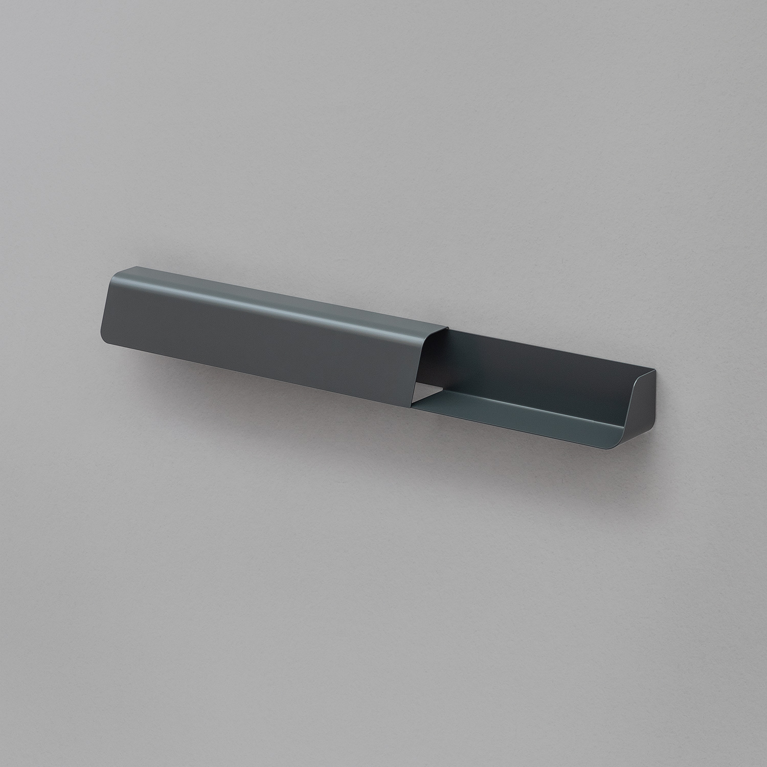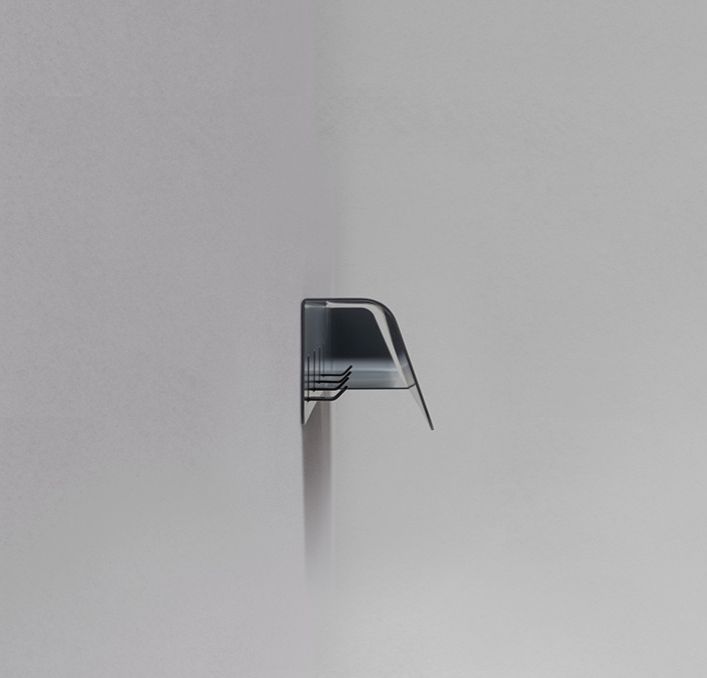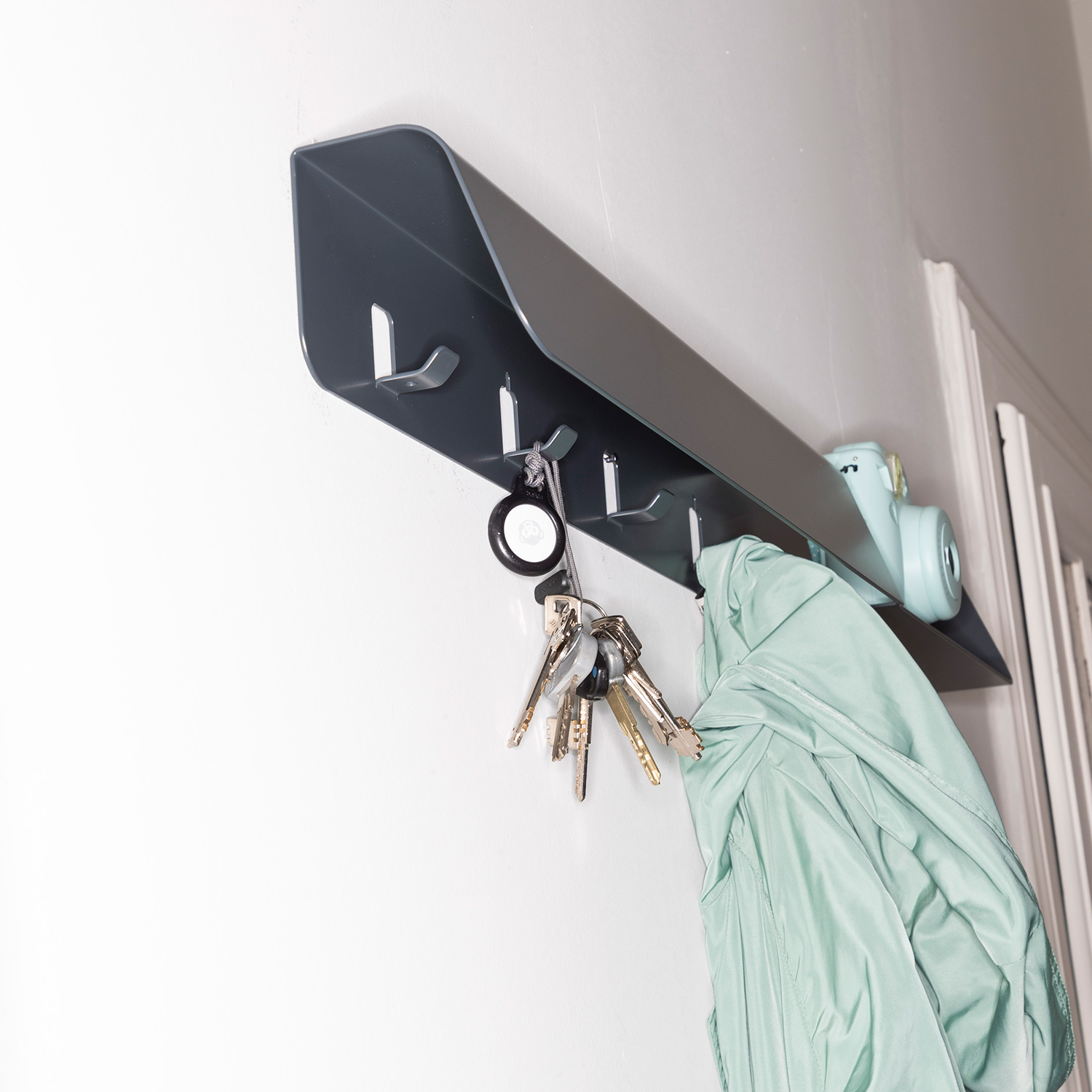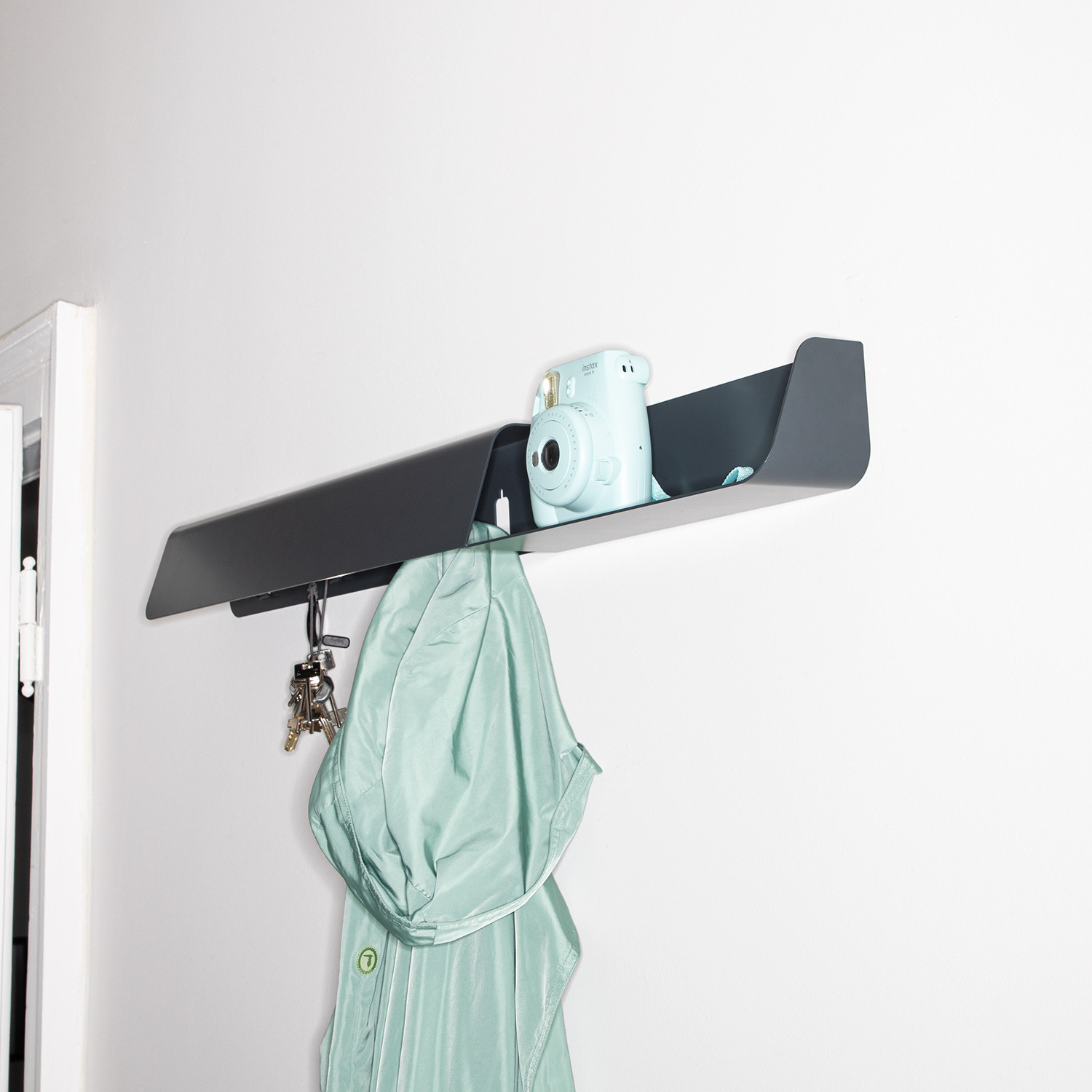 Dock is a design by the young Italian trio Busetti, Garuti and Redaelli and consists of a 90 cm folded painted steel sheet that divides into two sections, one of which fitted with four hooks and the other offering a small object tray.