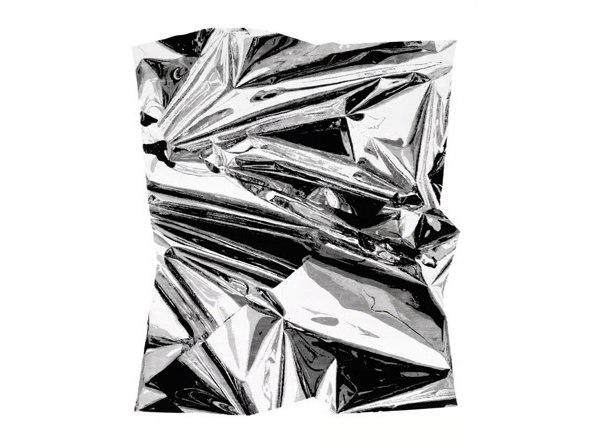 For his untitled foil works, the artist arranges silver foil on canvas intuitively, referring to the tradition of Abstract Expressionism. Reyle had picked up on the material some years ago in a Berlin store’s window display and directly forged links between the decorative material and the act of painting on canvas. The action of draping becomes the thematic focus of the paintings, while light is also incorporated as a sculpting element.