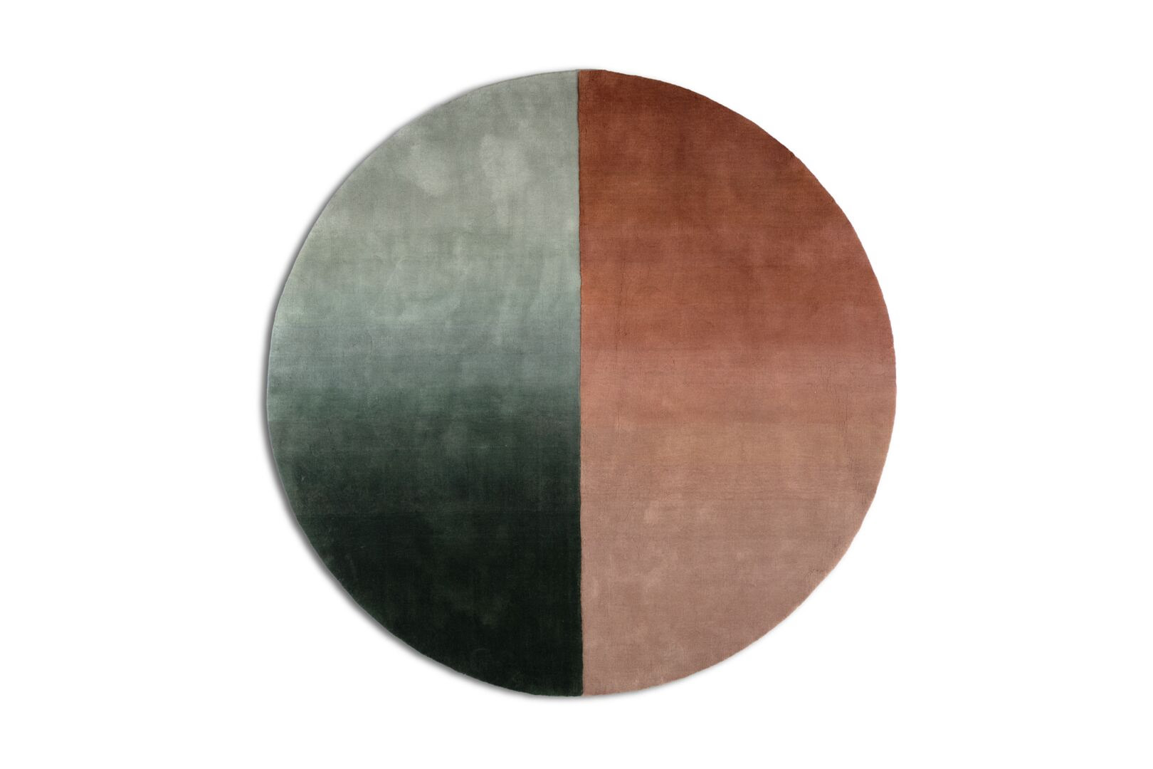 The color combinations are offered in two versions: the circular one plays with shades of mint green, dark green, and praline, while the square version pairs cyclamen, violet, and orange for a bold yet balanced visual impact. Entirely hand-knotted and finished, Noor is a decorative piece that transforms any space with a visual language made of light, color, and material.