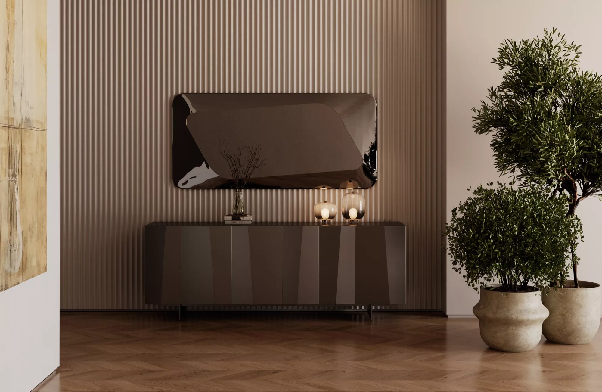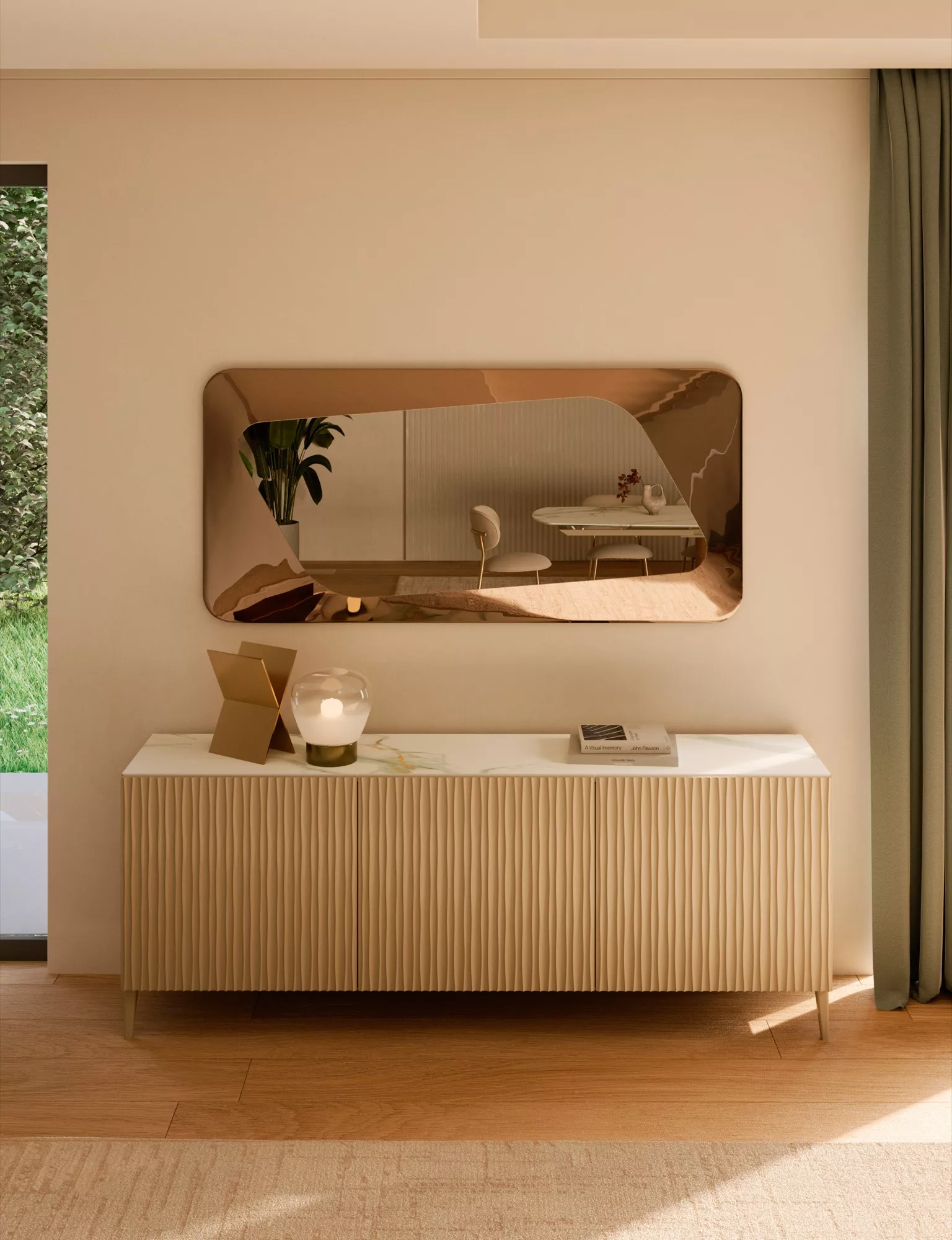 The Focus mirror, made from cast glass, captures the beauty of controlled imperfection, expanding the space, revealing texture and dressing the wall with both lightness and depth.