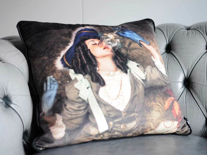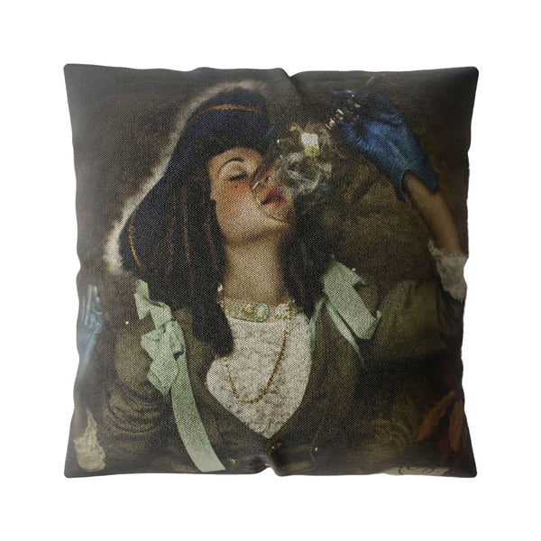 Take a seat and relax with this beautiful cushion cover, reminiscent of classic Dutch Old Master paintings it pictures a woman drinking from a large glass of purest swirling air.
